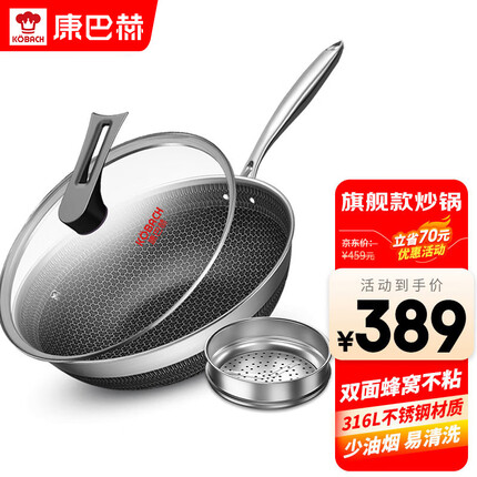 1.5.康巴赫炒锅316L不锈钢炒菜锅双面蜂巢不粘锅32cm旗舰款配蒸屉电磁炉通用