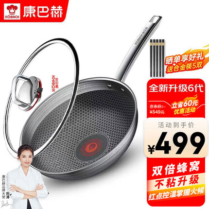 1.2.康巴赫第六代炒锅不粘锅抗菌不锈钢炒菜锅双蜂窝锅红点32cm电磁炉燃气灶