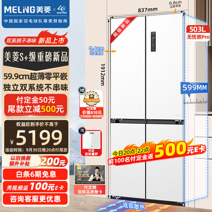 ¥3299 · 京东1.3.美菱(MeiLing)【无忧嵌Pro】503升十字对开门冰箱家用无霜变频一级能效 双系统599mm超薄嵌入BCD-503WPU9CZX白
