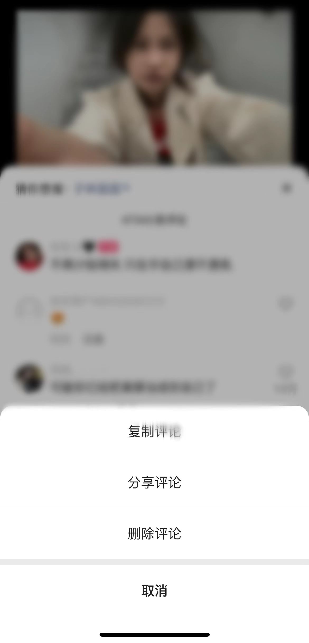 2.找到想要删除的评论,长按评论,下方会弹出选项,在分享评论下方有删除评论,点击即可删评,前提是自己发的评论可以删除,不能在别人的作品下删除别人发的评论。