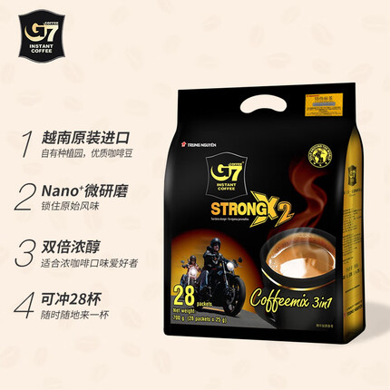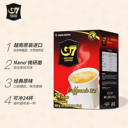 G7咖啡,属于中档咖啡,是来自越南的进口产品,在速溶咖啡行业内口碑比较好。黑咖啡也比较正宗,口味比较好。