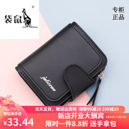 ¥38 · 京东1.2.袋鼠轻奢品牌小钱包女简约短款女士小巧钱夹三折折叠多功能时尚竖款皮 073短款黑色 8卡位1拉链1钞位