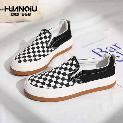 环球帆布鞋,上脚很舒适,经典的高低帮情侣款式,比较百搭。也有红色系列、棋盘鞋、饼干鞋这种比较有个性一些的款式,风格整体上比较休闲。